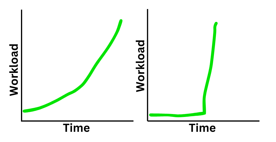 The graph on the left shows a gradual ramp in workload, which gives your shins time to adapt to increased stress and not flare up. The graph on the right shows the normal route that people take, from complete rest to full activity.